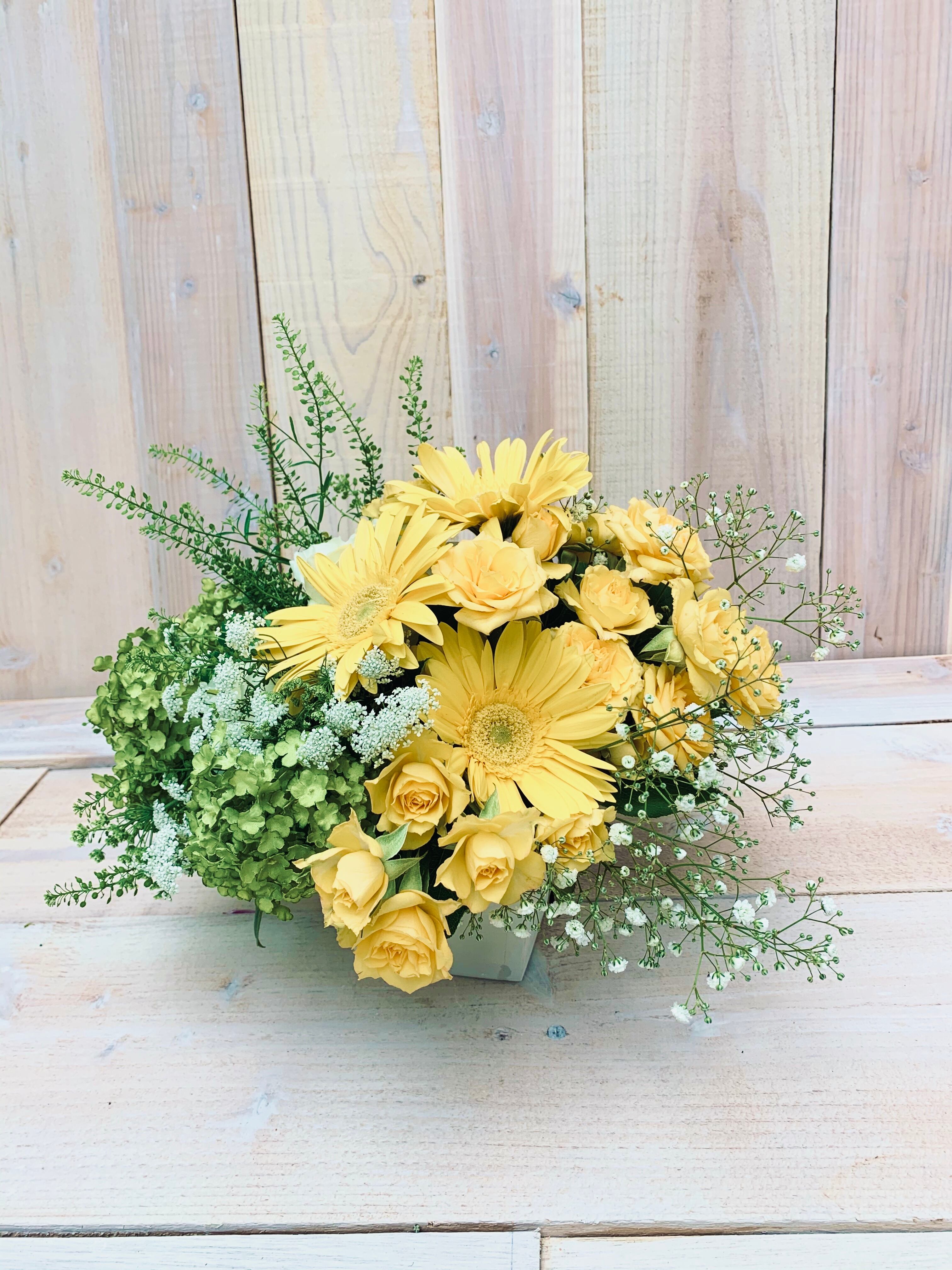色合いはイエロー系などを中心としたアレンジメントフラワーをお届けいたします
